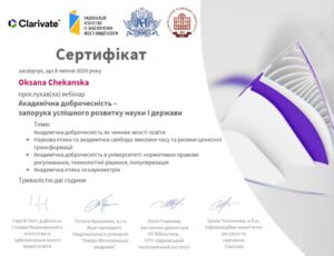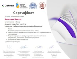На сьогодні в умовах активізації роботи з виявлення плагіату в наукових текстах, посилення відповідальності за вчинення неправомірної вигоди, академічного шахрайства або виникнення конфлікту інтересів між учасниками освітнього процесу досить гостро постає питання академічної доброчесності в освітній і науковій діяльності закладів вищої освіти. З огляду на вищезазначене, за підтримки компанії «Clarivate Analytics» 8 липня 2020 року відбувся вебінар «Академічна доброчесність – запорука успішного розвитку науки і держави», у якому взяли участь члени комісії з питань академічної доброчесності нашого університету (кандидат психологічних наук Оксана Чеканська, кандидат педагогічних наук Тарас Пухальський, кандидат педагогічних наук Вадим Зданюк) та методист вищої категорії навчального відділу, кандидат філологічних наук Зореслава Шевчук.